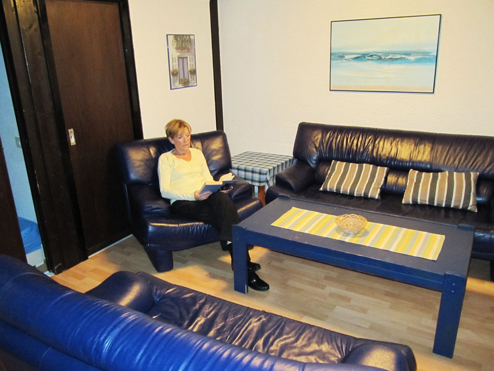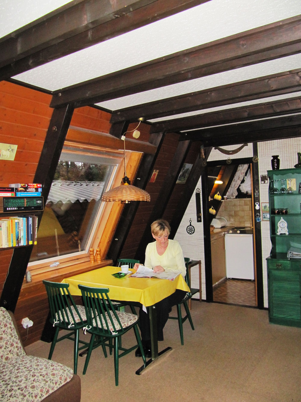 Im Erdgeschoss gemütlicher Wohnraum, Partyküche, Dusche und WC, Terasse.